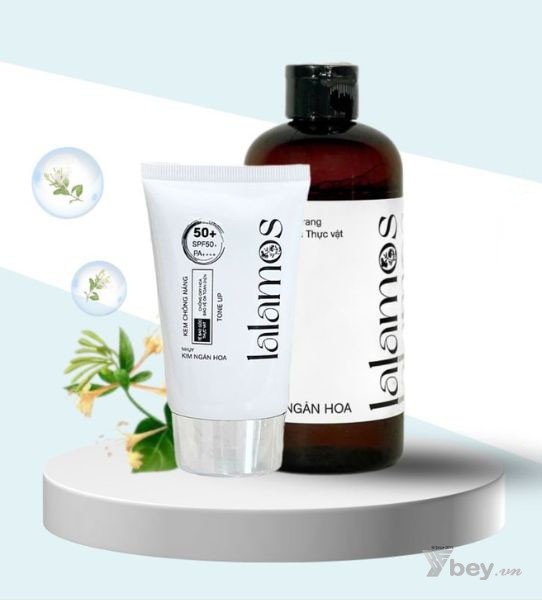 | Tên sản phẩm | Bộ đôi Nước tẩy trang và Kem chống nắng nâng tone, dưỡng ẩm Lalamos Nhụy Kim Ngân Hoa SPF 50+ PA++++ |